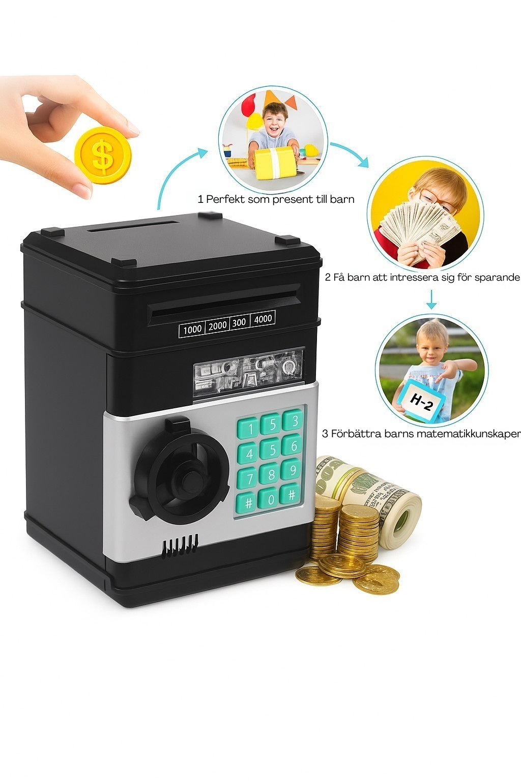 Med MiniBanken får barnen lära sig värdet av pengar och uppmuntras att spara till sina egna mål på ett tryggt och engagerande sätt.